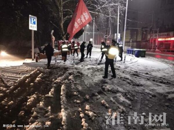 1月31日凌晨大雪纷然而至。该局应急人员迅速响应,立即奔赴扫雪第一线。他们除雪忙碌的身影给大雪纷飞、寂静寒冷的夜色增添了暖意。1月31日早间,该局人员全部到位,兵分五路,人工、机械结合作业。采取扫、推、洒、融、堆等有效措施,对城区丁山路、八公山路、建北路等主干道及商业街西门、八仙街南门等重要路口以及商场、菜市场、居民区出入口等重点区域积雪进行集中清除。该局督促沿街商户、居民“自扫门前雪”,并发动广大市民共同参与积雪清理,开展义务帮扶救助,最大限度降低雨雪恶劣天气带来的损失。