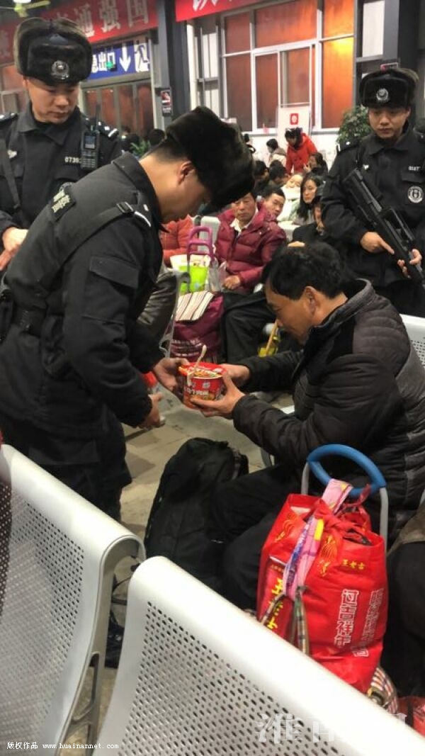 一位家住凤台县的盲人童大哥在一位好心人的帮助下来到民警值班室,希望民警帮他送上火车,前往浙江打工。民警了解情况后立即去帮童大哥取了票,然后一路扶着他进入候车室。一切安顿好后,得知童大哥早早出了家门,到现在还没有吃饭,民警们又从值班室内端来一碗热气腾腾的方便面送到他手上,让其暖暖身子。