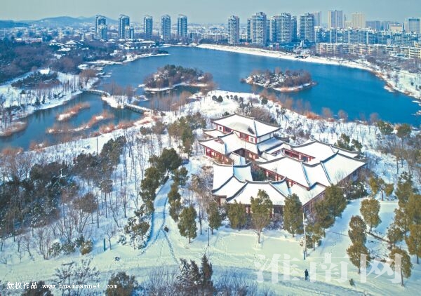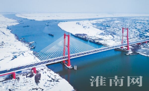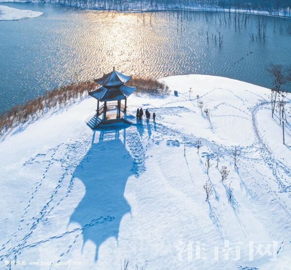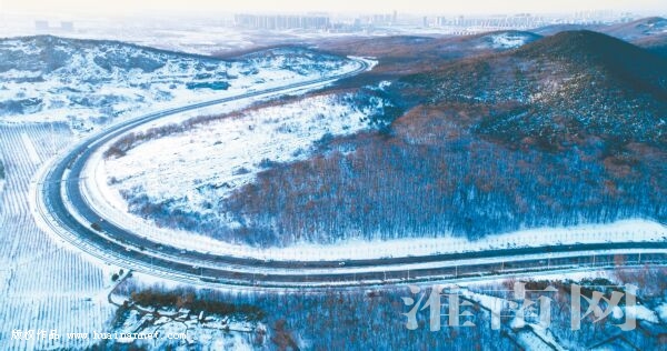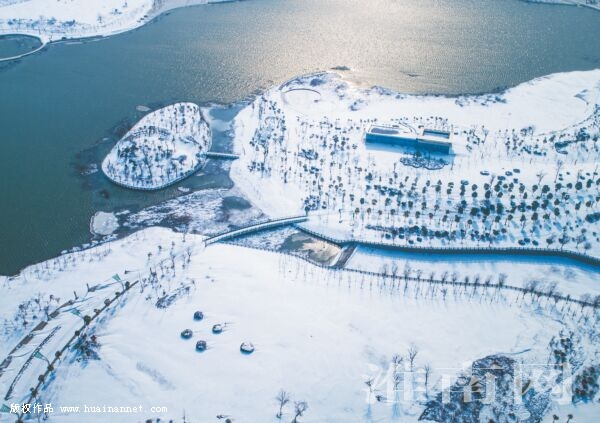 空中鸟瞰淮南雪后美景,景色如画。白雪皑皑,湿地、群山、建筑、桥梁、乡村披上白色外衣,如童话世界,美不胜收。(陈涛柱 张桂芳 摄)