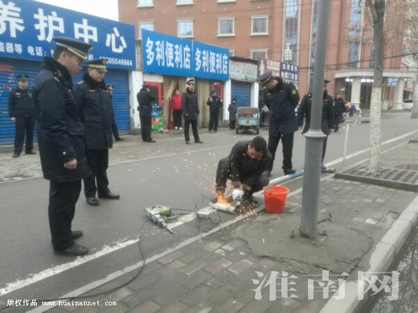 对于这种情况,田家庵区城管行政执法局积极探索新方法进行解决。孙志壮介绍,经过多次尝试,发现通过将埋入地面下的硬质隔离桩切割出多个倒刺的方法效果不错,也能节约成本。