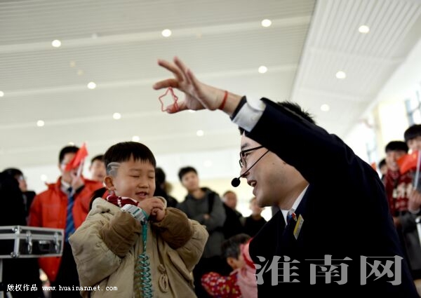 春运期间,淮南西站党员职工吴硕发挥会变魔术特长,为一名小旅客用橡皮筋变出一颗许愿五角星,送去春运旅途欢乐。