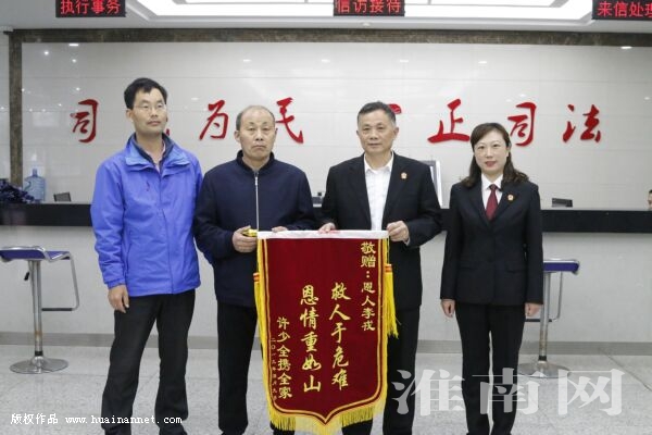 “敬赠恩人李戎,救人于危难,恩情重如山。”4月9日上午,在田家庵公安分局园南派出所民警的陪伴下,62岁老人许少全带着家人来到淮南市中级人民法院,向从冰冷的淮河里把他救起的中院赔偿办主任李戎表示感谢。
