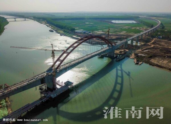 4月18日,空中俯瞰建设中的商合杭铁路跨淮河特大桥雄姿。位于寿县境内的跨淮河特大桥是商合杭铁路重要控制性工程之一,主桥结构为(112+228+112)米预应力混凝土连续刚构箱梁-柔性拱组合结构,全长452米,主跨228米,采用的Ⅲ型板式无砟轨道技术,不仅具有完全自主知识产权,而且领先世界,为当前高速铁路无砟轨道连续刚构拱桥世界第一。为实现商合杭北线开通目标,中铁八局商合杭十标段项目部建设者加紧施工,预计4月20日轨道板粗铺完成,4月25日钢管拱吊索终张完成,4月30日完成轨道板施工。(记者 倪军 陈海涛 编辑 汤宁)
