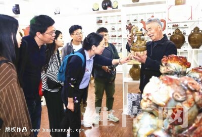 安徽省非物质文化遗产项目寿州窑制作技艺代表性传承人沈德亮从艺近60年,积累了丰富的陶瓷制作经验,其研发的文房用具、花盒、香炉等系列陶瓷作品具有独特的文化内涵。沈德亮坚持义务传艺,传承弘扬寿州窑陶瓷技艺。图为沈德亮向淮南师范学院学生讲解陶瓷制品技艺。(通讯员 潘雪洁 记者 朱庆磊 编辑 汤宁)