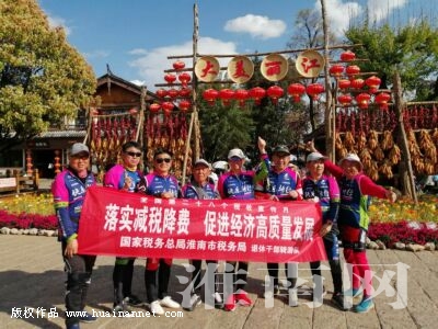 (记者)日前,淮南市大通区税务局退休老干部王兆林和其他退休人员组成的退休干部骑游队,带着一幅写有“落实减税降费,促进经济高质量发展——国家税务总局淮南市税务局退休干部骑游队”的横幅,从云南昆明出发,开启了绵延千里的骑行,义务宣传税收新政的活动。