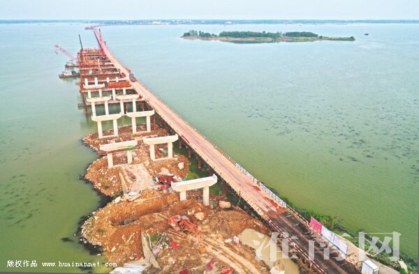 6月11日,空中鸟瞰建设中的寿县瓦埠湖大桥。瓦埠湖大桥及连接线项目起点位于寿县堰口镇,终点位于长丰县庄墓镇交界,总长26.76公里,投资约8亿元。瓦埠湖大桥的开工建设,对于改善瓦埠湖两岸交流,促进瓦埠镇、大顺镇等瓦埠湖东岸乡镇的经济发展、促进寿县旅游开发具有重要意义。截至6月1日,工程已完成瓦东瓦西引桥桩基72根,主桥桩基33根,主墩支栈桥和平台6个,引桥支栈桥和平台29个,立柱30根及系梁14道。该桥预计2020年底建成通车。(记者 倪军 通讯员 陈涛柱 编辑 汤宁)