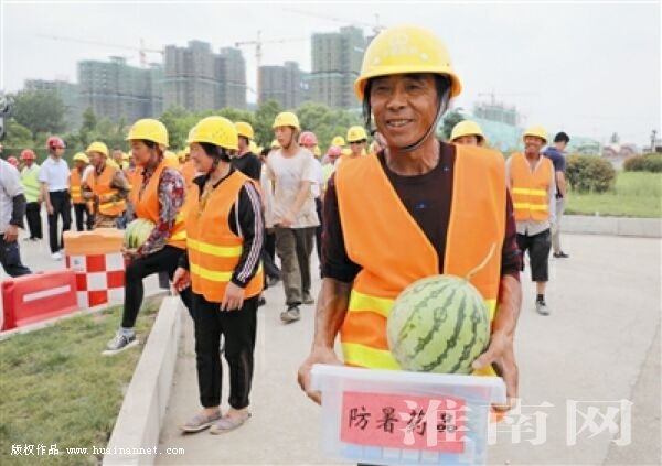 6月25日下午,淮南高新区管委会和淮南铁城投资建设公司负责同志来到中铁四局淮南高新区道路工程PPP项目部,为在高温下施工的南经十六路工地上的筑路工人们送上防暑药品、西瓜和矿泉水。(记者 张越 编辑 汤宁)