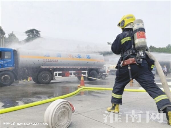 日前,田家庵区组织开展了2019年道路危险货物运输应急演练。演练模拟一辆危险货物运输车发生交通事故,导致危险货物泄漏,参演人员与车辆通过协调联报、现场处置等步骤进行了系统的模拟演练,进一步提高了突发事件应急反应速度和应急救援能力。 本报记者 李东华 本报通讯员 吴喆敏 摄