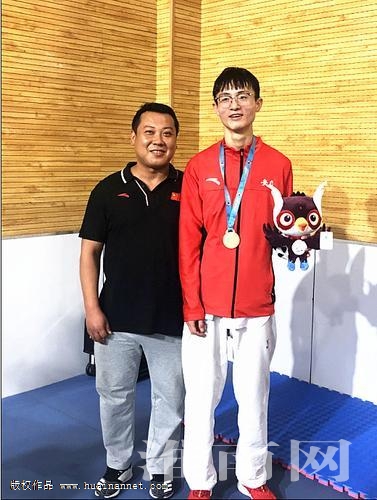 图二:选手曹光辉获奖后与教练王辉合影留念。