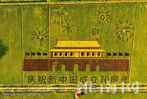 从2016年开始,安丰塘稻田画已经坚持了4年,画面内容年年更新,今年以“新中国成立70周年”为主题,通过种植不同品种、不同颜色叶子的水稻,以稻田做画布、以秧苗为颜料,绘制出具有地方文化元素的“稻田画”。从空中俯瞰,“撸起袖子加油干、实现中华民族伟大复兴”的字样清晰可见,天安门、长城、华表的图案美轮美奂, “天下第一塘”为新中国成立70周年献上了一份独特的贺礼。 (记者 张越 柏松 通讯员 赵淮鸣)