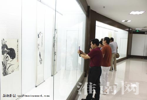本次展览是淮南市博物馆与宿州博物馆的一次成功合作。共展出萧龙士不同时期书画作品及冯其庸、李百忍等名家为萧老百岁贺寿作品43幅,基本全面展示了萧龙士先生一生的艺术成就。此次展览也是加强宿州、淮南两地书画交流的良好开端,有利于两地书画艺术的推陈出新、再创辉煌。图为市民将喜爱的作品拍下来。