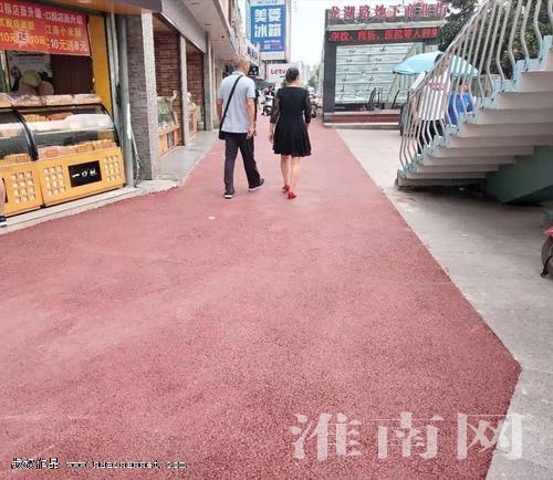淮河早报、淮南网记者特别注意到,接近国庆路路段的人行道铺设的沥青是红色的,可正常的沥青不应该是黑色的吗?对此,柏剑锋介绍道,这次铺设的彩色沥青是工程中的一个亮点,“我们市政工程公司是淮南市唯一一家能够自行生产彩色沥青的单位。”他说,之前广场路和中央公园南停车场也铺设了彩色沥青,“它告别了传统黑色沥青的沉闷,能够让路面看起来更美观,更舒适。”据了解,施工单位8月份就对彩色沥青混凝土设备进行了改装和调试,这次在“龙湖中路提升人行道改造工程”中采用彩色沥青进行铺设,是一次全新的尝试,届时也会让市民们眼前一亮。