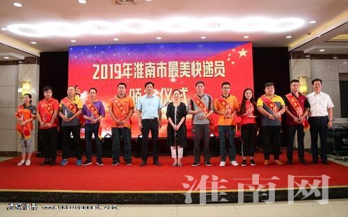 “十一”国庆节即将到来之际,淮南市邮政管理局、市快递行业协会于9月20日举办了庆祝中华人民共和国成立七十周年,颂歌献给祖国暨最美快递员颁奖典礼。10名2019年淮南市“最美快递员”身披绶带,在各寄递企业代表的见证下登台受奖,他们表示,将化荣誉为激励,在今后的工作中尽责尽力,继续全心全意为广大市民做好寄递服务。