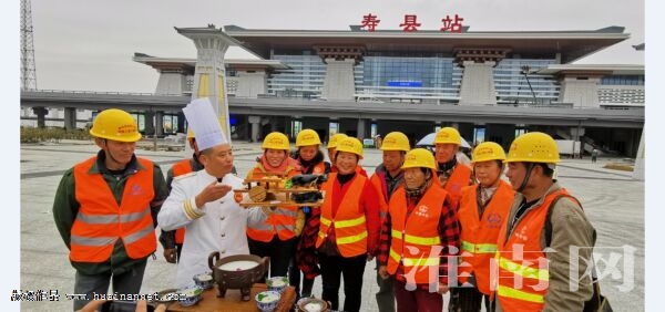 11月26日,淮南文艺轻骑兵来到商合杭铁路寿县站施工现场,为一线施工人员送来精彩的文化大餐。寿县站由中铁上海局建筑公司承建,目前各项施工任务已完美收官,预计12月1日正式开通运营。届时,该站最高可接纳700人的出行,将极大方便市民的日常出行。图为豆腐传承人现场表演。 (记者 陈海涛)