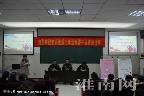 (记者 王伟)为进一步提高中小学生的法律意识,增强法制观念, 12月19日下午,老龙眼派出所民警来到淮南二十六中,给学生们上了一堂生动的法制教育课,赢得在场近百名师生的一致好评。