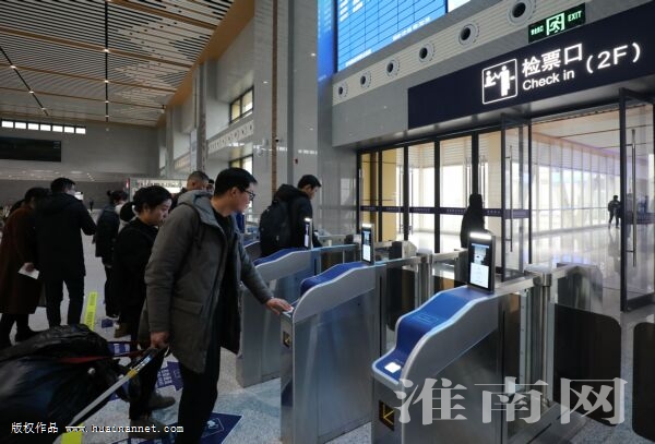 12月30日零时起,全国铁路施行新的列车运行图。据了解,此次调图,中国铁路上海局淮南西站管内旅客列车,特别是高铁列车开行情况变化较大。其中淮南南站增量最为明显,共开行旅客列车67.5对。我市旅客从南站出发,可以往来于兰州西、深圳北、广州南、昆明南等地,较以往更加快捷便利。图为旅客刷卡进站。(记者 张越)