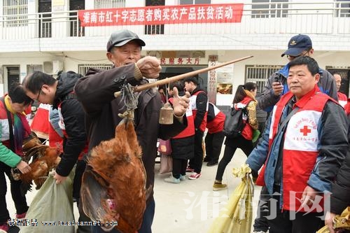 2019年12月28日下午,在寿县隐贤镇牌坊村委会门口,人头攒动、人声鼎沸,时而还伴着阵阵鸡鸣声,好不热闹,可这却不是集贸市场,而是市红十字会组织的一场特别的扶贫“交易”。