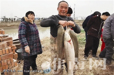 1月1日,在凤台县杨村镇,渔老大苏克乐清起鱼塘准备年鱼上市。在我市乡村,有春节前渔民集中售鱼的传统,一些清塘现场,不少大鱼刚一出塘即被抢购一空。(记者 苏国义)