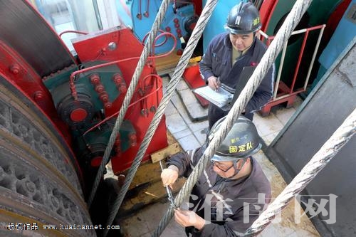 图为该矿固定队检修班两名职工正在检查主井绞车绳径。(通讯员 陶志政)