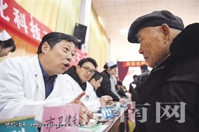 1月10日,我市文化科技卫生“三下乡”集中示范活动在潘集区平圩镇谢圩村举行,来自市文化、科技、卫生等部门工作人员为群众书写春联、健康义诊、发放优质种子,表演精彩的文艺节目,为群众送上“新年大礼包”。图为医务工作者为群众义诊。(通讯员 陈彬)