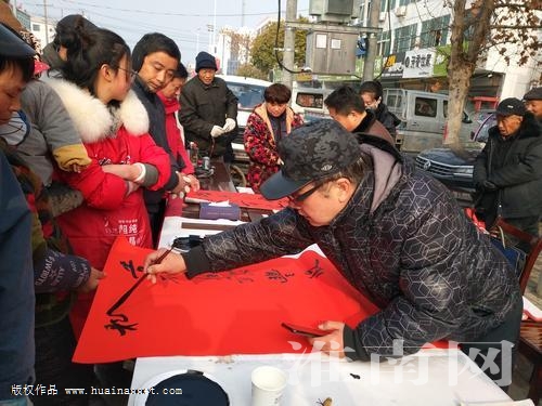 1月14日上午,市城乡建设局驻徐王村工作队邀请安徽省书画研究会的书画家来到凤台县朱马店镇,为城乡居民和贫困户送春联。(记者)