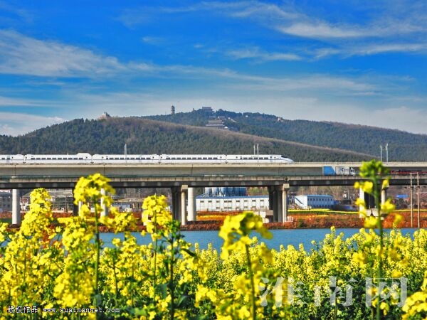 3月18日,一列高铁驶过寿县古城八公山下,穿行在花海中,成为春日里一道美丽的风景。(通讯员 陈 )