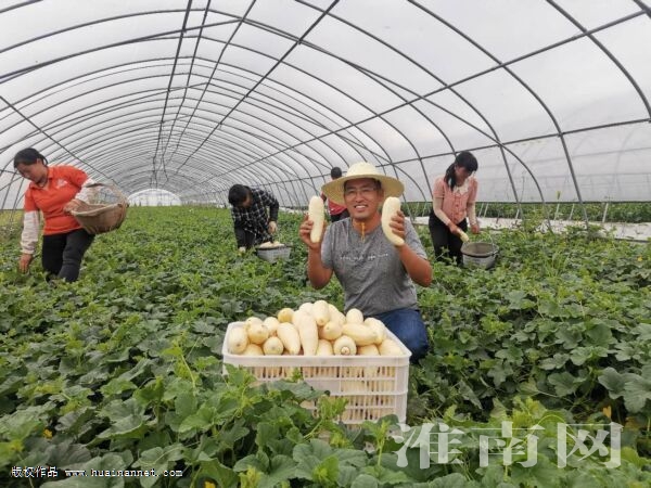 寿县正阳关花儿果蔬家庭农场积极实施产业带动进行扶贫,30多名贫困户常年在此务工,参与到家庭农场的培土、育苗、种植、施肥、采摘等全程管理,每年收入近3万元,稳定实现脱贫。图为工人们正在采摘成熟的白羊蜜酥瓜。 (记者 刘银昌)