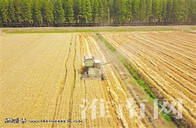 截至6月2日,寿县寿西湖农场5.46万亩小麦已抢收3.65万亩,预计单产500公斤以上。图为该农场集中大型机械抓住晴好天气进行抢收,确保夏粮颗粒归仓。 (记者 倪军 陈海涛)
