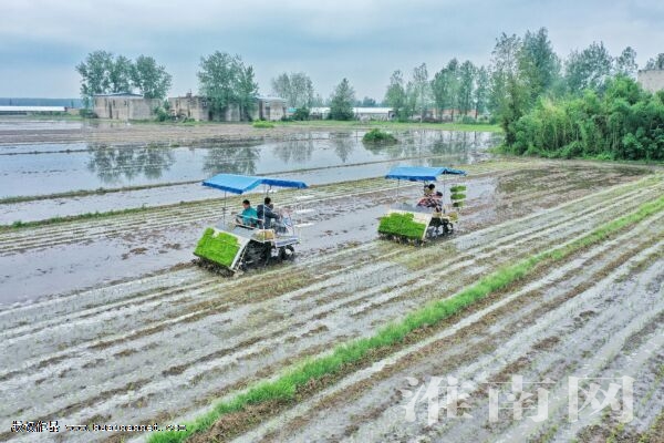 6月18日,凤台县岳张集镇怀彪农机服务专业合作社在进行水稻机插秧作业,该合作社托管农户的2000多亩稻田将在一周内栽插完毕。近年来,凤台县大力推广水稻机械化插秧技术,全县67万多亩水稻实现了机械化栽插。(记者 倪军)