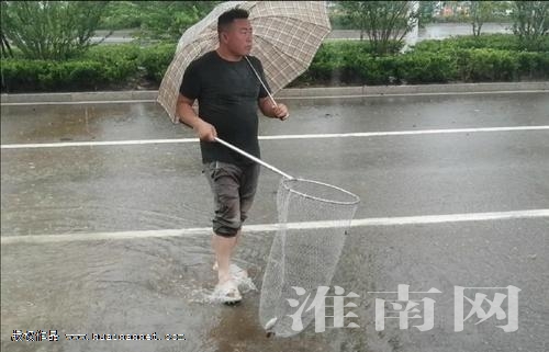6月28日上午,在高新区三和镇青桐大道与民惠街交叉路口南侧路段,由于暴雨造成该路段大量积水,附近居民发现有鱼后,就在路边捕起了鱼。淮河早报、淮南网记者在现场看到,虽然暴雨一直下个不停,居民依旧打着雨伞站在路边,拿着网兜没多久就从积水中捕到鱼。据居民介绍,可能是暴雨导致附近鱼塘或沟塘的鱼跑了出来,当天上午已经捕了十多条,大多为鲫鱼,大的有一二斤重。居民笑称,他们一家中午有吃的了。(记者 张明星)