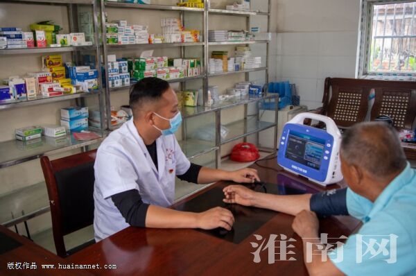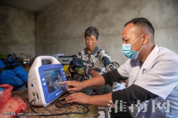 “感谢你,每次都跑这么远来给俺看病!”6月18日,凤台县岳张集镇六院村村医徐豹在给贫困户朱克果量血压。
