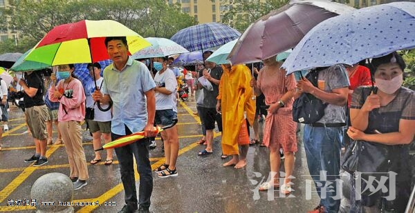 图十一:雨中,家长在考点外焦急地等待。