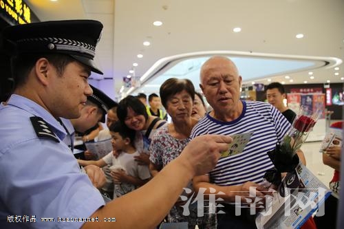 8月24日下午,淮南市公安局田家庵分局联合国庆路派出所在万达广场开展了一场别开生面的禁毒宣传。民警现场给路过市民发送宣传手册、禁毒小礼品、讲解毒品特征和危害,以及开展禁毒有奖问答等活动,提高市民识毒、防毒、拒毒意识。(记者 王玲 通讯员 郑世杰)