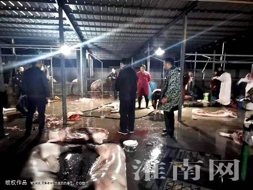 11月20日凌晨3时许,在谢家集区杨公镇与田家庵区曹庵镇交界处、102省道旁的一处钢架大棚里,面对神兵天降般的执法人员,10余名正在屠宰生猪的男男女女面面相觑、呆若木鸡。