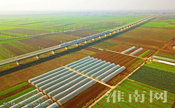 图二:东风湖万亩蔬菜基地翠色欲流,商合杭高铁穿境而过。一座座蔬菜大棚鳞次栉比,孕育着农民的新生活。