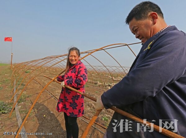 图七:毛集镇董岗村农民王康春夫妻俩忙着修理大棚,准备种植40亩大棚西瓜,用以弥补夏季作物损失。