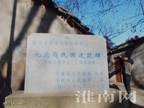 九龙岗民国建筑群现存单体建筑23幢,含淮南矿业所办公楼、“天地玄黄宇宙”建筑群两个市保文物保护单位,为20世纪20年代末,国民政府为开采九龙岗矿而初建。1938年日军侵占淮南时被占,成为日本侵略者掠夺淮南煤炭资源的历史见证。2012年6月,安徽省人民政府公布为安徽省文物保护单位。