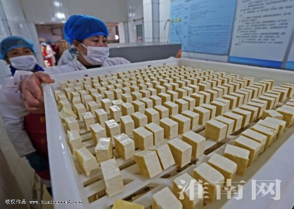 1月20日,在寿县八公山乡,安徽八公山豆制品公司帮扶车间正在生产豆腐乳。春节临近,该公司开足生产马力,将豆制品销往华东六省一市主要城市。八公山豆制品公司地处豆腐诞生地和豆腐文化发祥地,系国家级非遗项目“豆腐传统制作技艺”保护单位,公司安置本地农民146名就业,带动周边贫困人口192人实现增收,2020年贫困户人均年务工工资收入2.6万元,助力他们实现脱贫致富梦。 (记者 倪军 摄)