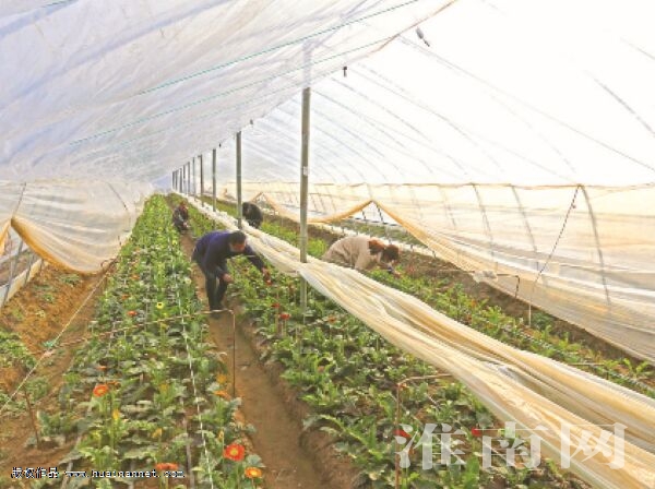 寿县张李乡阳光苗木花卉种植基地主要种植康乃馨、扶郎花、洋甘菊等切花产品,产品销往上海、浙江、合肥等地。图为当地村民正在基地劳动。