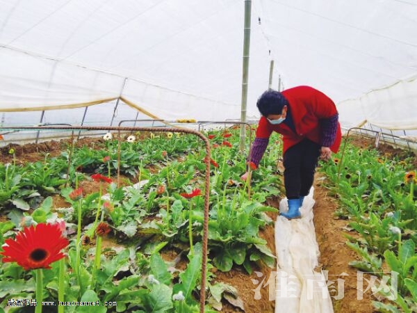 3月6日,在寿县张李乡劳模产业扶贫基地的花卉种植大棚里,农村妇女卞士莉正在管理花苗。据了解,该乡花卉种植近百亩,花卉品种多,一年四季鲜花不断,在市场上颇受欢迎,目前主要销往浙江、上海和合肥等地的大型花卉市场。今年以来,由于花卉种植规模不断扩大,带动了当地近20名农村妇女就近就业、增收致富。特别是“三八”妇女节期间,市场鲜花需求旺盛,每天可销售两三百把康乃馨、非洲菊等。(记者 廖凌云)