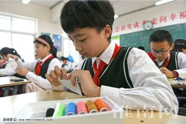 3月18日,淮师附小六(4)班学生在劳动课上学习钉扣子。近年来,淮师附小注重小学生生活劳动技能培养,通过钉扣子、系鞋带、叠衣服等日常生活技能锻炼,增强学生劳动能力,培养学生热爱劳动好习惯。(通讯员 怀 轩 摄)