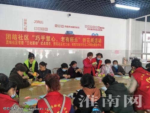 (记者 柏雪)3月24日下午,八公山区新庄孜街道团结社区居家养老服务中心内其乐融融,来自社区的15名老人正在跟随社区工作人员学习折纸花。原来,这是该社区省级“三社联动”试点项目特意为辖区老人打造的“巧手慧心,老有所乐”折纸活动。