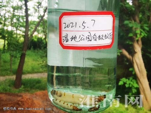 当天下午,淮河早报、淮南网记者见到了这三只保存在酒瓶里的白蚁。蚁王体长约1厘米,体形瘦小呈褐色;一只蚁后体长较长,约6厘米,另一只蚁后较短,约3厘米,两只蚁后体形肥硕呈白色。舜耕山管理处副主任孟峰介绍,近期他们在湿地公园树林里发现一些树木被白蚁啃食的现象非常严重,于是组织了专业白蚁防治公司开展白蚁防治工作。