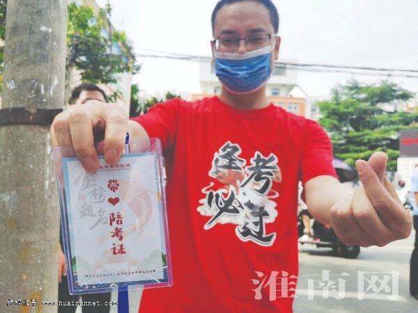 家长姜先生穿了一件印有“金榜题名”的红色T恤,他告诉淮河早报、淮南网记者,这件衣服已经准备很久了,7号一大早就穿上了,为儿子加油。还有一位家长不仅穿了一件印有“逢考必过”的红色T恤,还佩戴了一张“陪考证”,他高兴地说:“这张陪考证是单位发的,单位这两天给我放假了,让我专心陪考!”