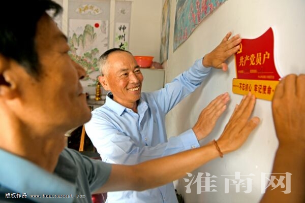 寿县堰口镇在党史学习教育中,推出“共产党员户挂门牌”活动,全镇1700余户党员家中最显眼的位置挂上“共产党员户”门牌,让农村党员把身份亮出来,发挥党员先锋模范作用,争当乡村振兴致富带头人的表率,方便群众监督。图为7月23日,堰口镇江黄村老党员陶善平(右)在驻村工作队帮助下,悬挂“共产党员户”门牌,介绍自己入党经历。(通讯员 怀轩)