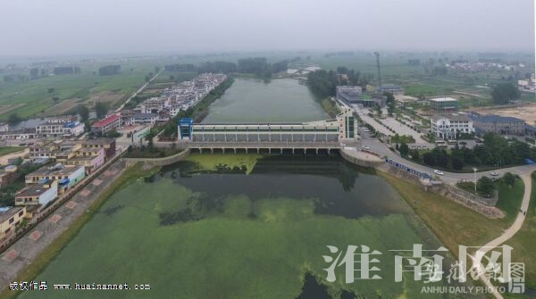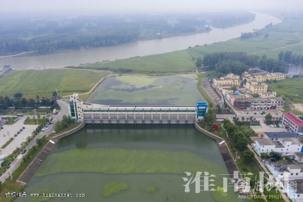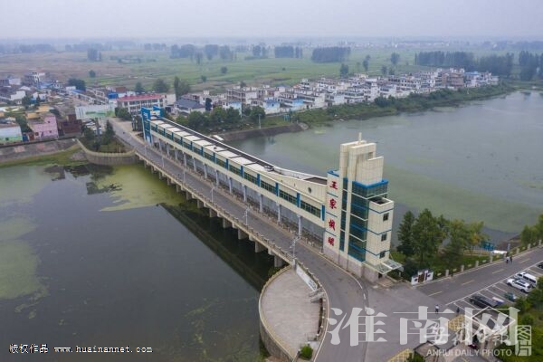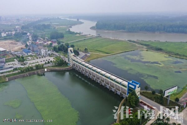 8月11日下午,在阜南县王家坝镇航拍英姿飒爽的王家坝闸。 该闸兴建于1953年元月10日,竣工于同年7月14日,2003年淮河大水后拆除重建,系淮河中上游重要水利枢纽工程。王家坝闸建成至今,已有13个年份16次开闸蓄洪,共蓄洪75亿立方,为淮河流域防汛抗洪发挥了重要作用。王家坝闸是千里淮河的“定盘星”,被誉为“干里准河第一闸”,先后被中宣部、水利部命名为“国家水利风景区”、“国家级水利工程管理单位”“国家湿地公园”、“全国爱国主义教育基地”。(记者 李博 摄)
