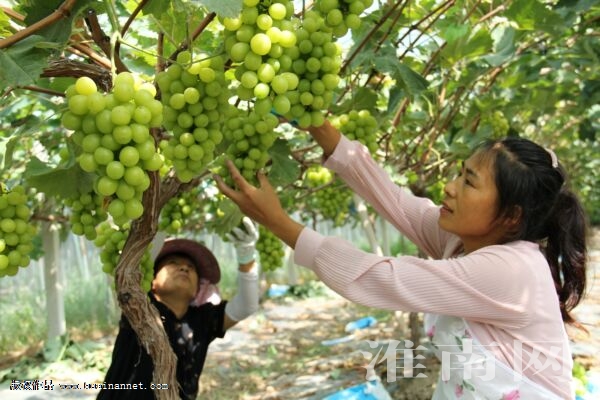 近年来,凤台县依托家庭农场和专业合作社,积极引导农民因地制宜调整种植结构,大力发展特色产业,增加农民收入,助力乡村振兴。图为该县省级示范家庭农场——丁集镇果儿多家庭农场工人在采摘优质阳光玫瑰葡萄供应市场。(通讯员 常开胜 摄)