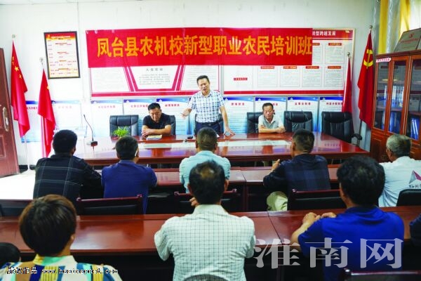 10月6日,在凤台县岳张集镇六院村怀彪农机服务专业合作社,县农机学校的技术人员在给农机手们上机收培训课。