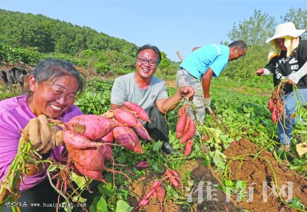 图七:连日来,在寿县八公山乡郝圩村,残疾人王士兵和社员一起喜挖丰收蜜薯。王士兵承包了100多亩鱼塘,喂了鸡、鸭、鹅。脱贫后的王士兵成立了合作社,因地制宜发展蜜薯种植。金秋十月,近100亩蜜薯成熟。