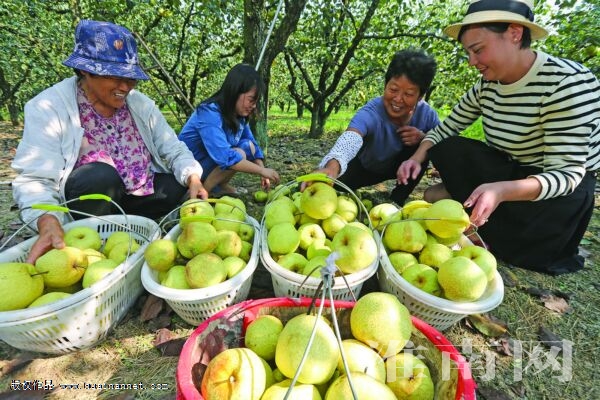 图四:果农在寿县八公山乡郝圩村的梨园内采摘梨子。金秋时节,该村的4500余亩梨子喜获丰收。寿县八公山乡积极调整农业种植结构,借助“万亩果园”美誉,大力发展优质水果种植,增加农民收入,助力乡村振兴。